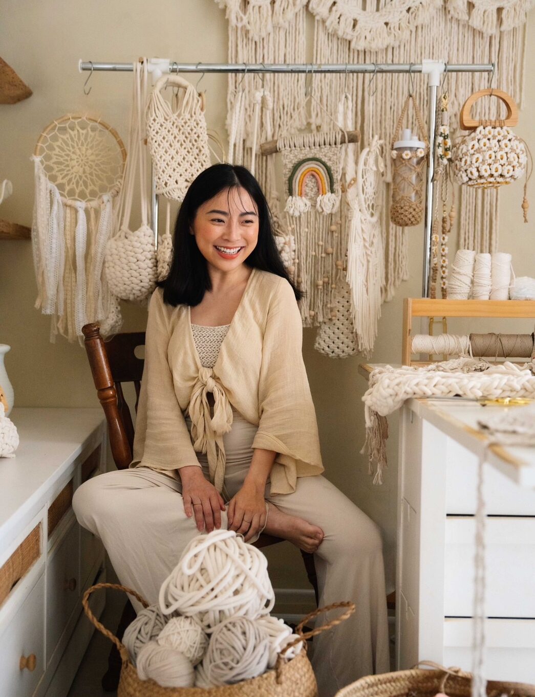 Boho À La Mode 的創辦人 Michelle,以獨有的編織美學,深受 Prada、Miu Miu、Jo Malone 等國際頂級品牌青睞,受邀打造大型裝置藝術,是圈內公認的藝術創作者。然而,當「一人藝術家」面臨時間與家庭的雙重夾擊,她渴望的不只是接案,而是更深遠的影響力。打破「藝術難以複製」的既定思維,她透過「打造品牌線上學院」實戰班,將那些原本只存在於手中的感性直覺與職人經驗有系統拆解,轉化為可傳承編織體系。「讓感性的藝術擁有理性的商業骨架,這趟旅程讓我明白,真正的自由是讓才華得以規模化。」